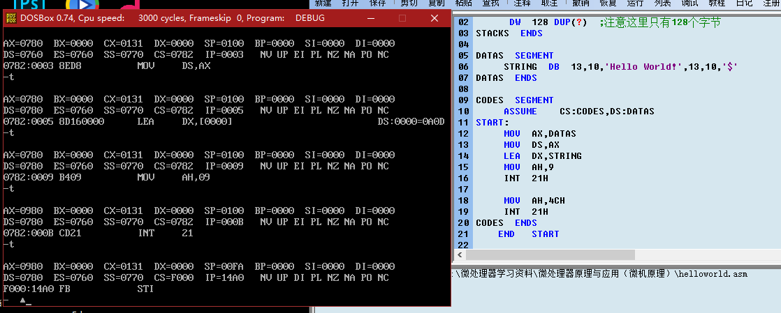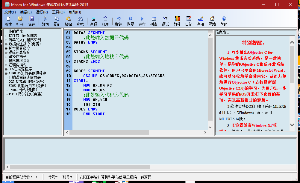 通过在dos下的编译过程,了解了通过汇编如何使一个程序运行,masm有点相当于c语言的运行,之后生成一个obj文件,然后link就是连接,生成一个exe可执行程序。在window下,通过Masm for Windows 集成实验环境 2015这个软件,大致了解了汇编语言编写的一些规律性,分成段来看这些代码。在进行debug的调试中,通过-t来执行一条条的汇编指令,目前只能看懂mov这种类型的,mov ax,bx这种就类似于A=B,把B的值代入A 中。